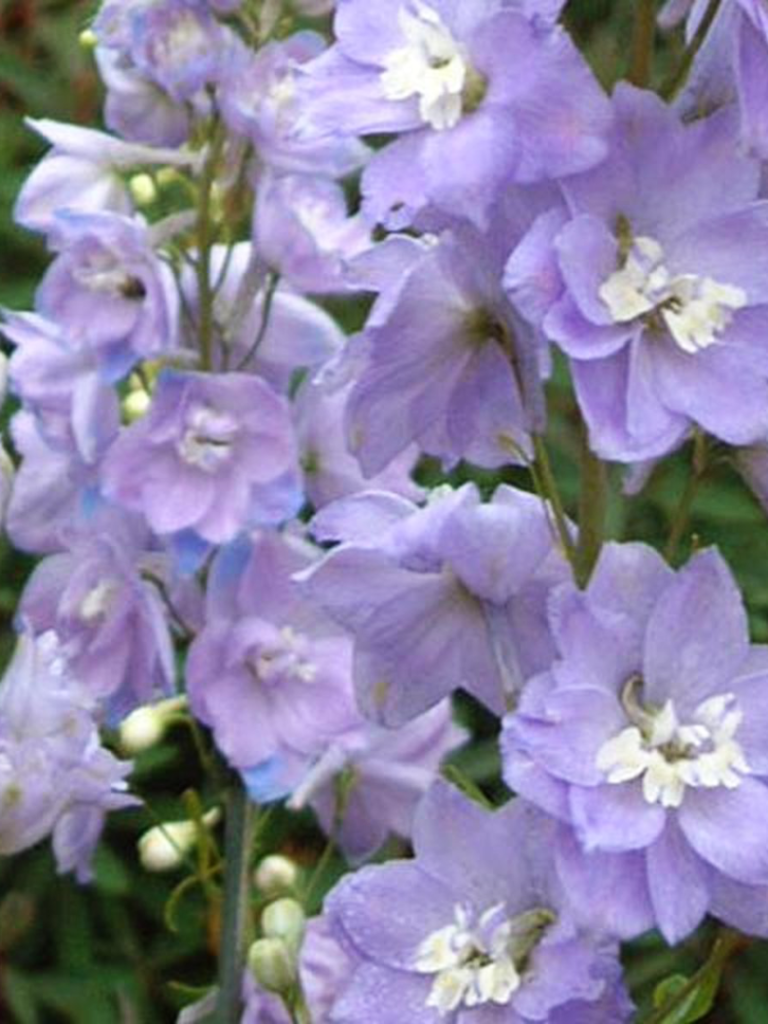 Daudzgadīga dārza delfīniju šķirne no “Pacific Giant” sērijas ar gaiši zilas – lavandas krāsu ziediem un gaišu vidiņu.