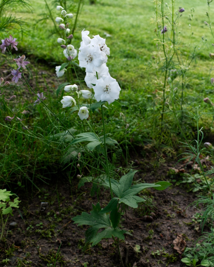 Dārza delfīnija ar baltiem ziediem. Šo daudzgadīgo delfīniju sēklas sēj no marta līdz aprīlim. Sēklām jādīgst tumsā! Pirms sēšanas Pirms sēšanas sēklām ieteicams iziet aukstuma periodu (stratifikāciju), tās ievietojot ledusskapī uz 7-14 dienām. Laukā izstāda pēc salnām, saulainā vai nedaudz ēnainā vietā. Piemērotas grieztajiem ziediem. Delfīnijas ieteicam uzreiz pēc noziedēšanas nogriezt, veicinot jauno ziedkātu veidošanos, tādējādi pagarinot ziedēšanas laiku līdz pat salnām. Jāņem vērā, ka delfīnijas ir indīgas!