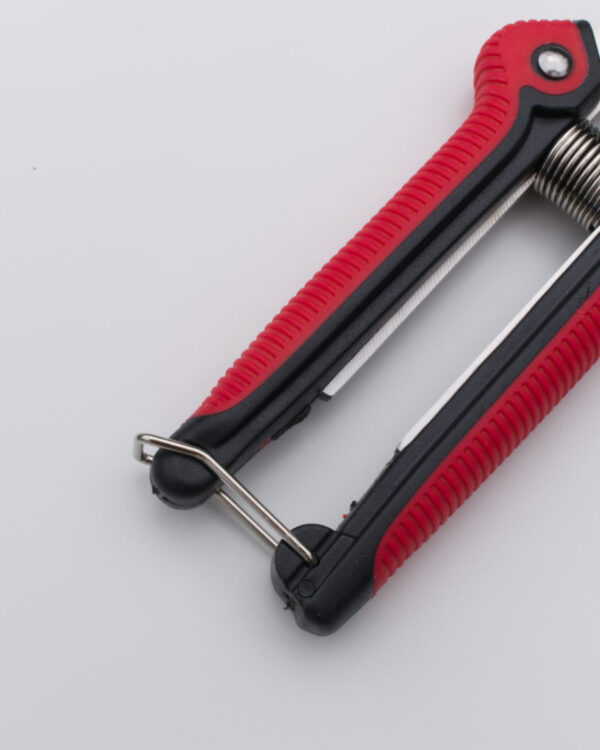 Plastmasas rokturis ar pretslīdes gumijas pārklājumu un metāla drošības klipsi.